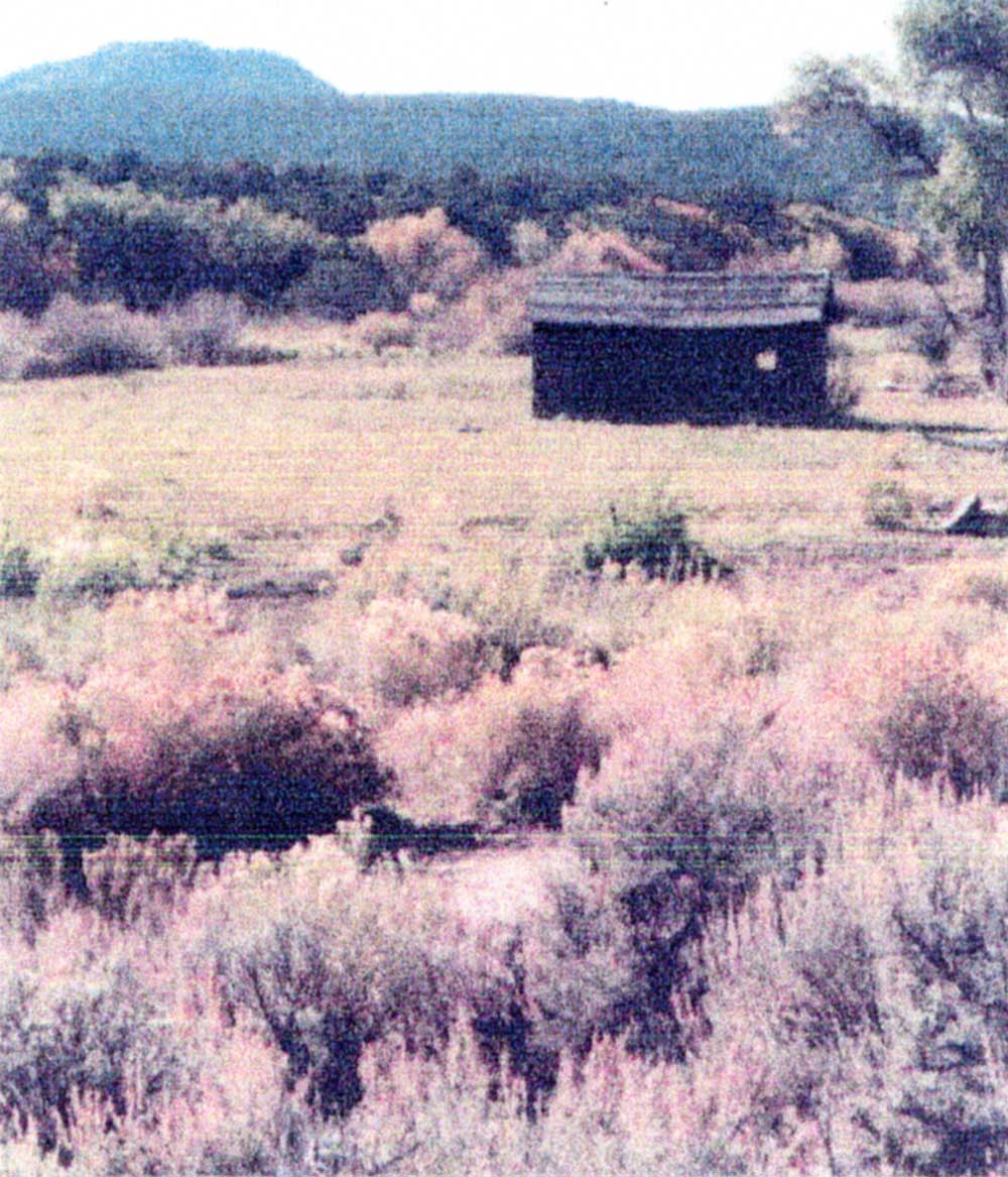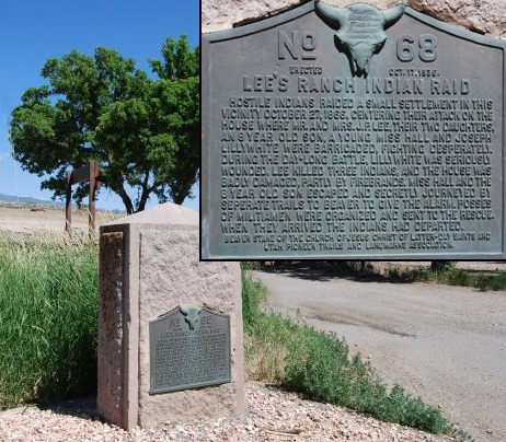 Hostile Indians raided a small settlement in this vicinity October 27, 1866, centering their attack on the house where Mr. and Mrs. J. P. Lee, their two daughters, and 8 year old son, a young Miss Hall and Joseph Lillywhite were barricaded, fighting desperately. During the day long battle, Lillywhite was seriously wounded. Lee killed three Indians, and the house was badly damaged, partly by firebrands. Miss Hall and the 8-year-old son escaped and secretly journeyed by separate trails to Beaver to give the alarm. Posses of Militiamen were organized and sent to the rescue. When they arrived the Indians had departed.Lee’s cabin as it appears today with the old cabin still standing.