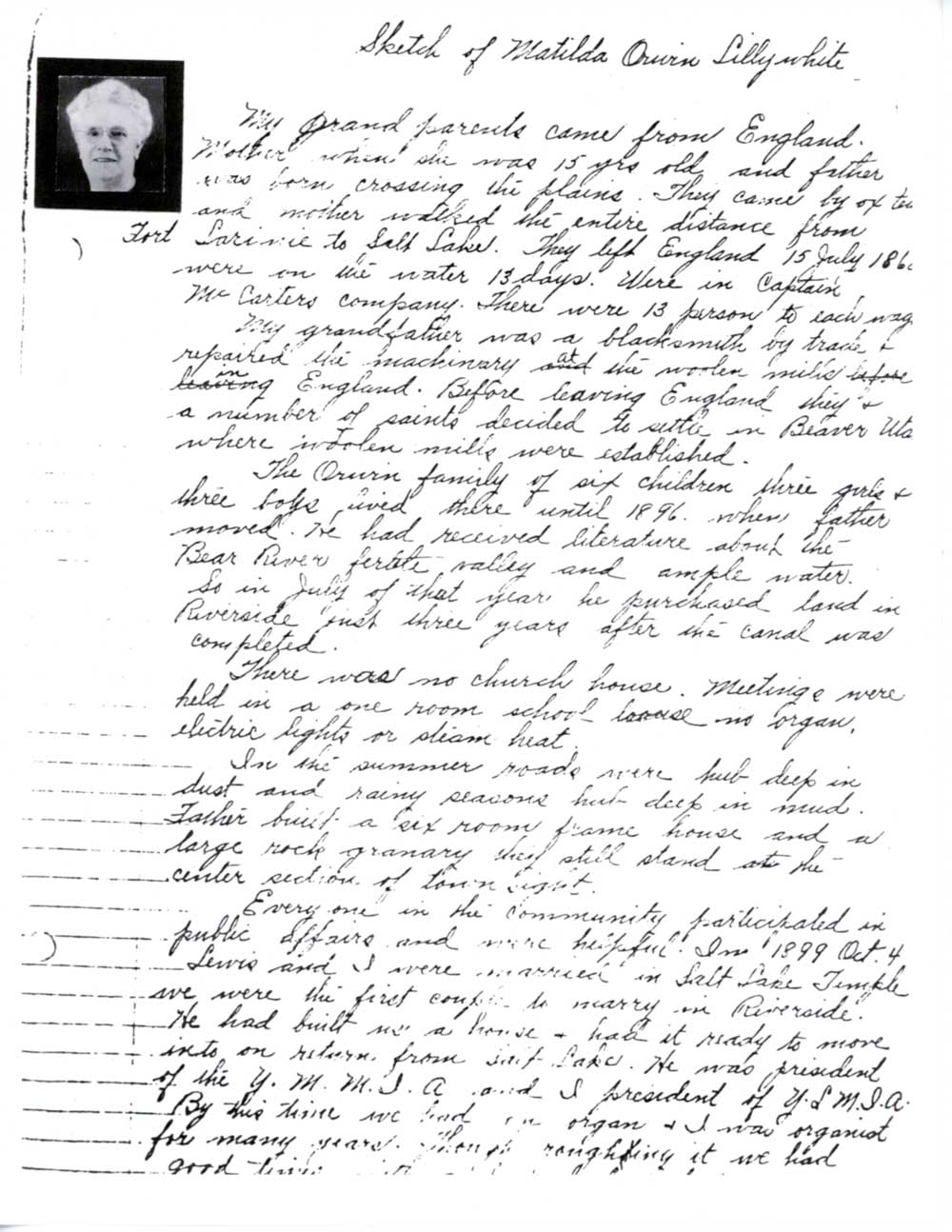 My parents and grandparents and six children (three girls and three boys), lived in Beaver until 1896. The seasons are short in Beaver and always have a scarcity of water. Father got some literature of the Bear River Canal being built and a fertile Bear River Valley with ample water, so in July of that year, he purchased land and moved his family north, settling in Riverside, just three years after the canal was completed.
