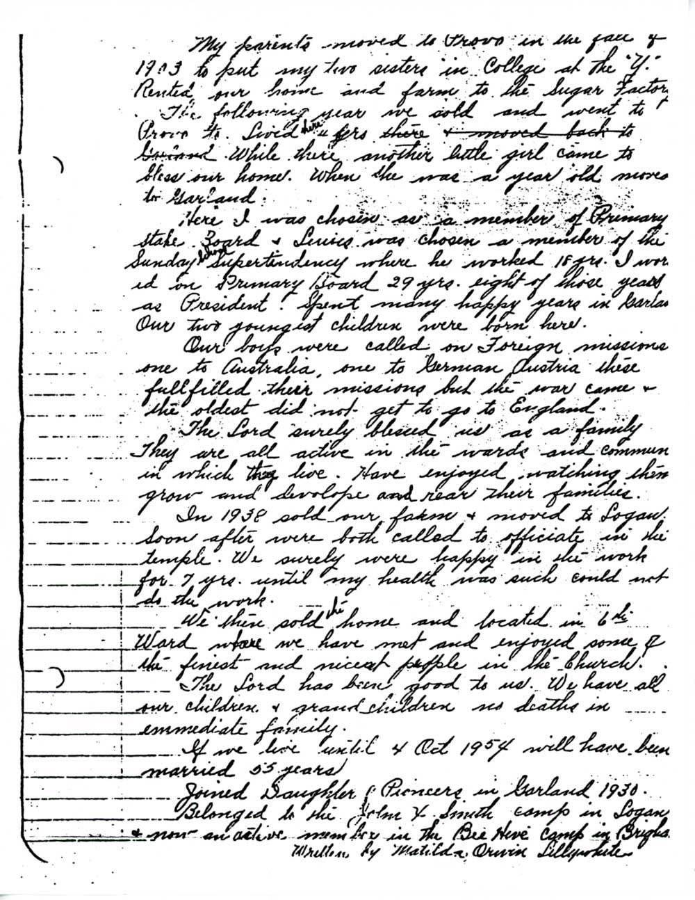 We sold our house, it having so may steps, and moved to Brigham City and located in the Sixth Ward, where we have met and enjoyed some of the finest and nicest people in the church. Although I have longed for our temple work, we loved Brigham City so much, especially my husband. I have tried to take my affliction with cheerfulness, because I know the Lord has been very good and merciful to us. We have all our children, twenty-six grandchildren and no deaths in our immediate family. If we live until October 4, 1954, we will have been married fifty-five years.