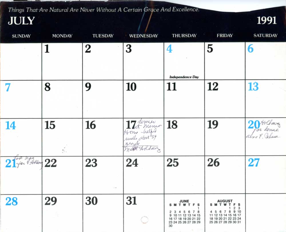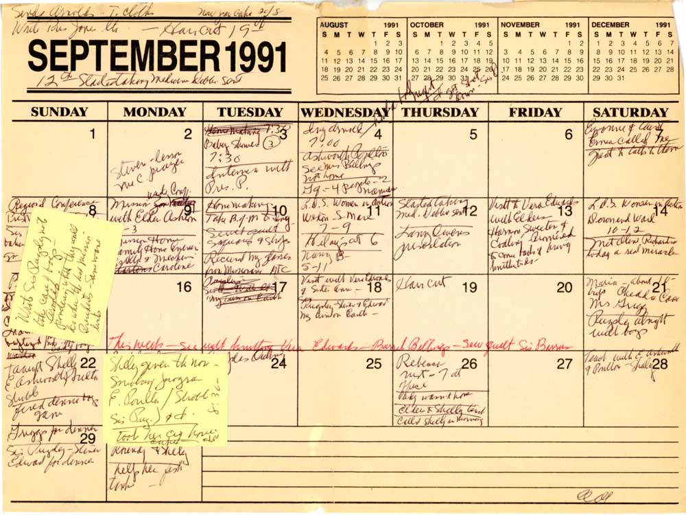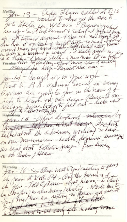 Note: A number of journal pages contained posted notes next to the date, with a brief description of the day’s activities. It is obvious that, except for a very busy missionary schedule and very long days, Sis. Noorlander intended to go back and fill out the pages using these notes.