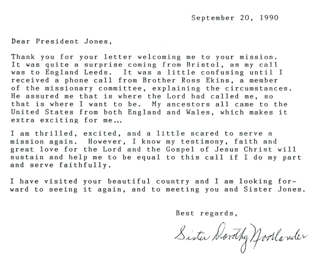 Thank you for your letter welcoming me to your mission. It was quite a surprise coming from Bristol, as my call was to England Leeds. It was a little confusing until I received a phone call from Brother Ross Ekins, a member of the missionary committee, explaining the circumstances. He assured me that is where the Lord had called me, so that is where I want to be. My ancestors all came to the United States from both England and Wales, which makes it extra exciting for me...