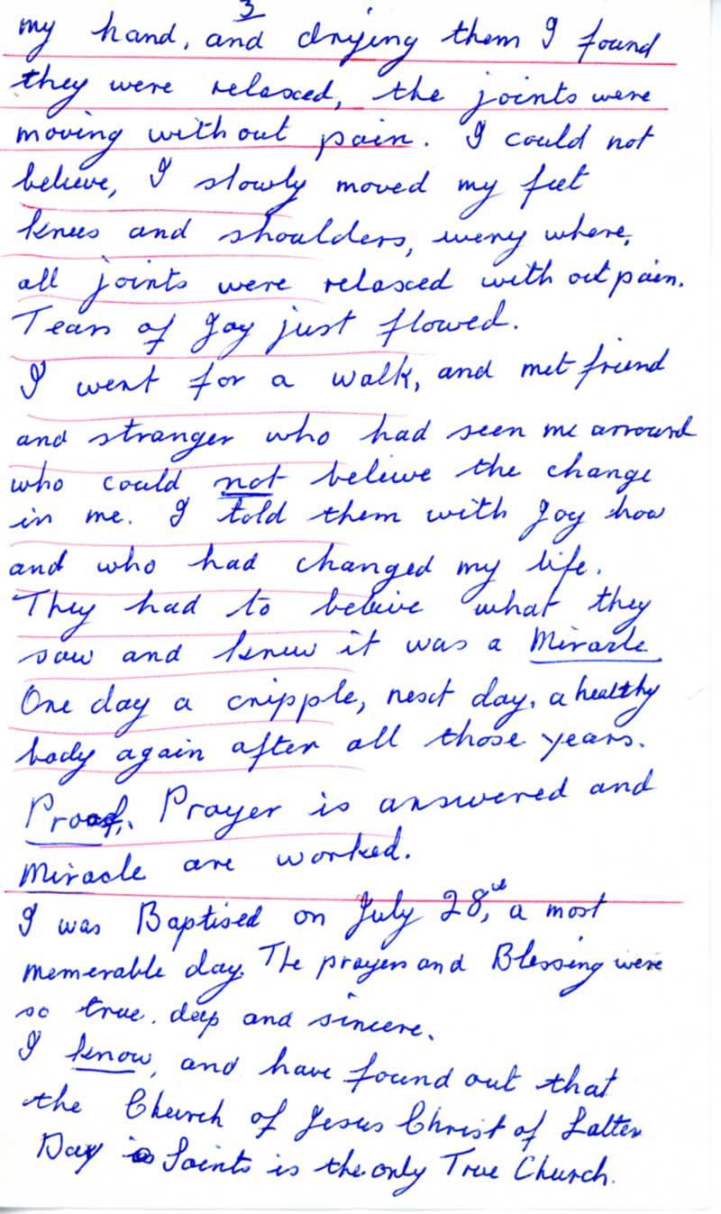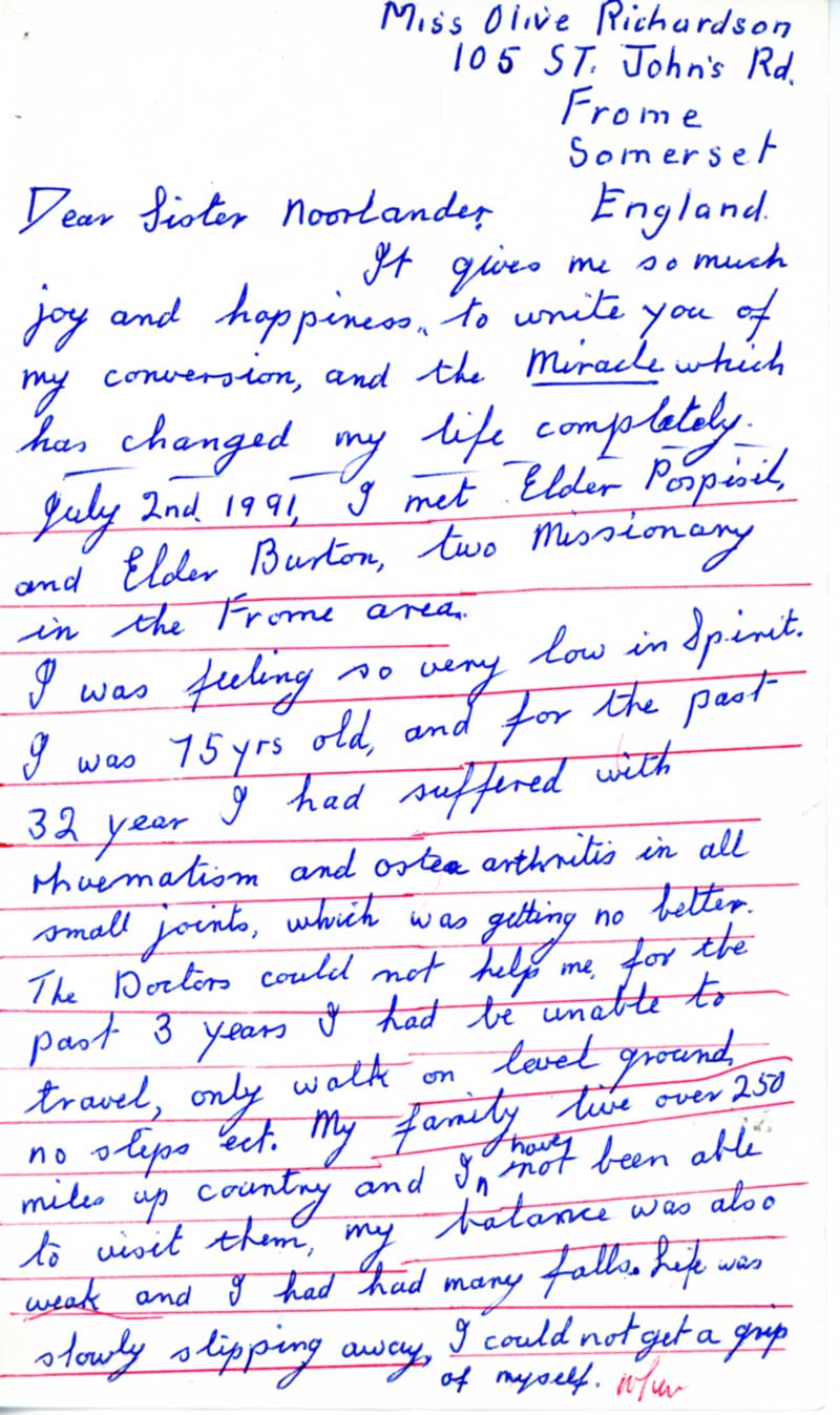 July 2nd, 1991, I met Elder Pospisil and Elder Burton, two missionaries in the Frome area. I was feeling so very low in spirit. I was 75 years old, and for the pat 32 years I had suffered with rhuematism and osteoarthritis in all small joints, which was getting no better. The doctors could not help me. For the past 3 years I had been unable to travel, only walk on level ground, no steps, ect. My family lives over 250 miles up country and I have not been able to vis them. My balance was also weak and I had many falls. Life was slowly slippying away. I could not get a grip of myself.