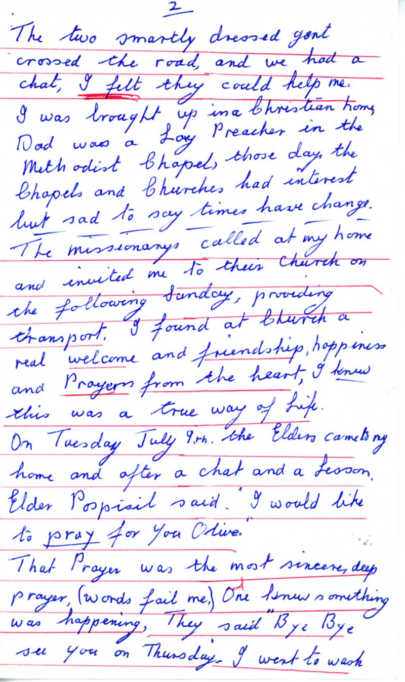 On Tuesday July 9th the Elders came to my home and after a chat and a lesson, Elder Pospisil said, "I would like to pray for you Olive." That prayer was the most sincere, deep prayer (words fail me), and one knew something was happening. They said, “Bye bye, see you on Thursday.”